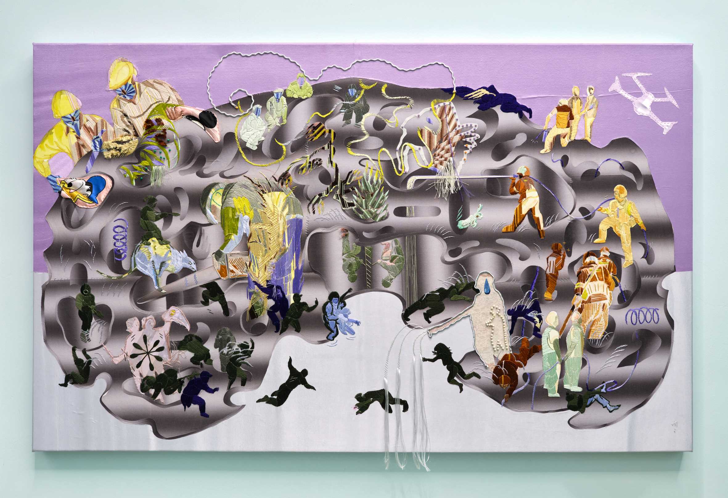 周周作品-南半球的大火FireInTheSouthernHemisphere80-hx130-wx5-dcm墨、国画颜料、水性漆、亚麻布、彩虹纱、苏绣线;手工刺绣独版Unique2023