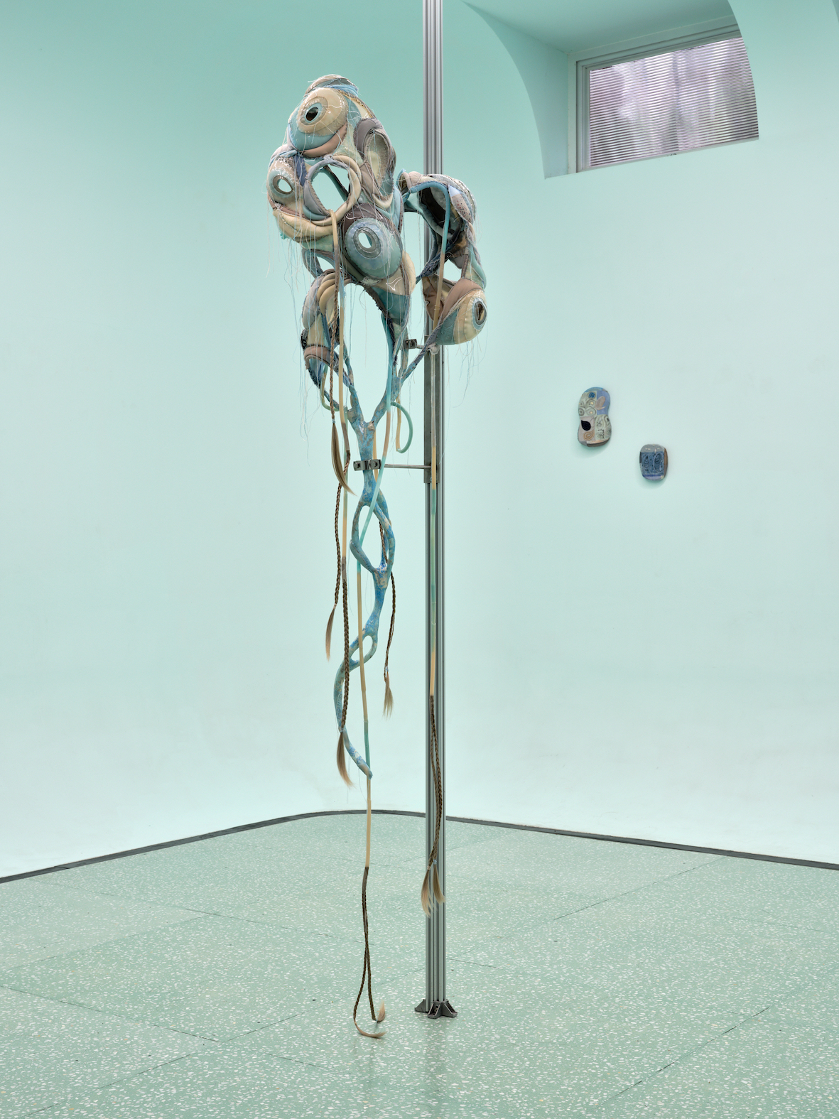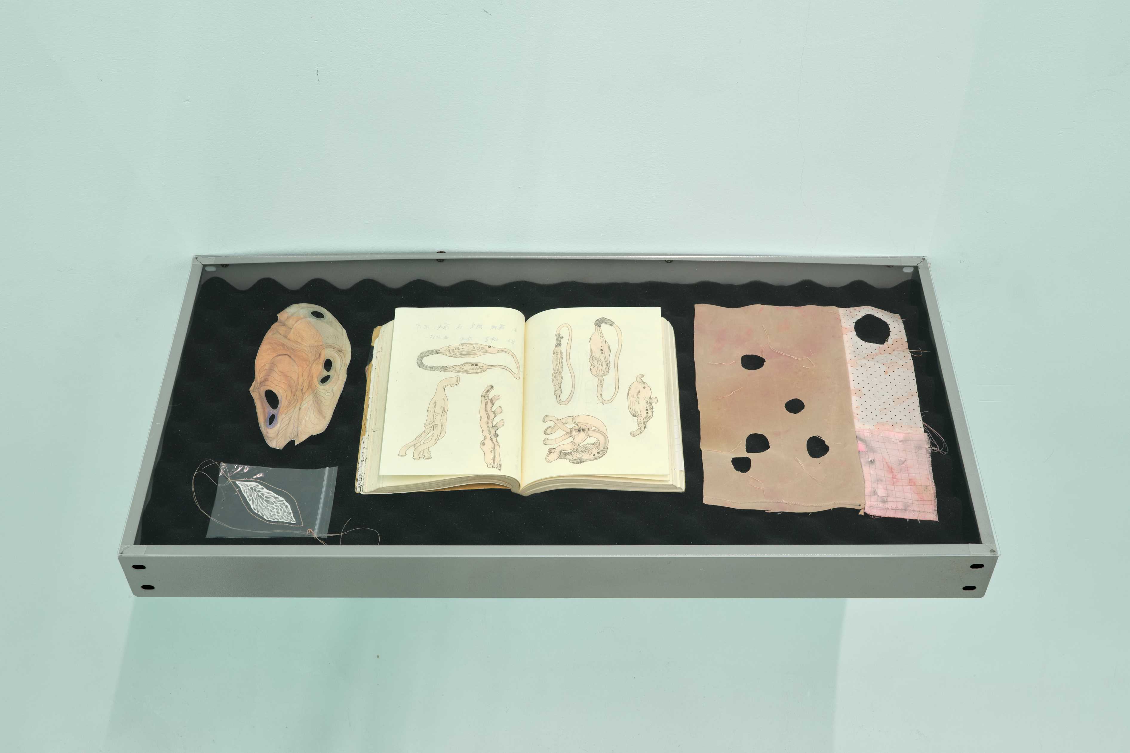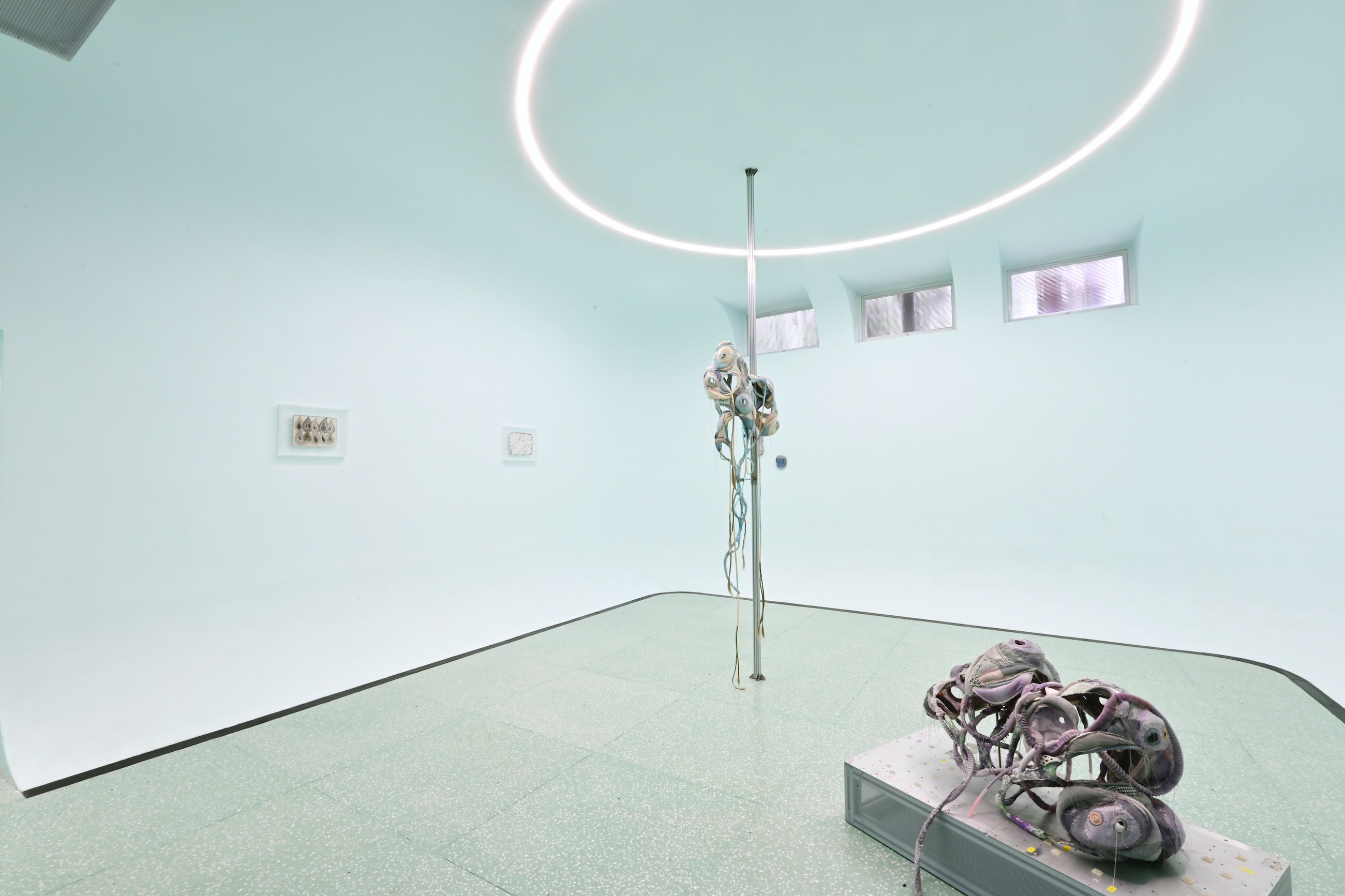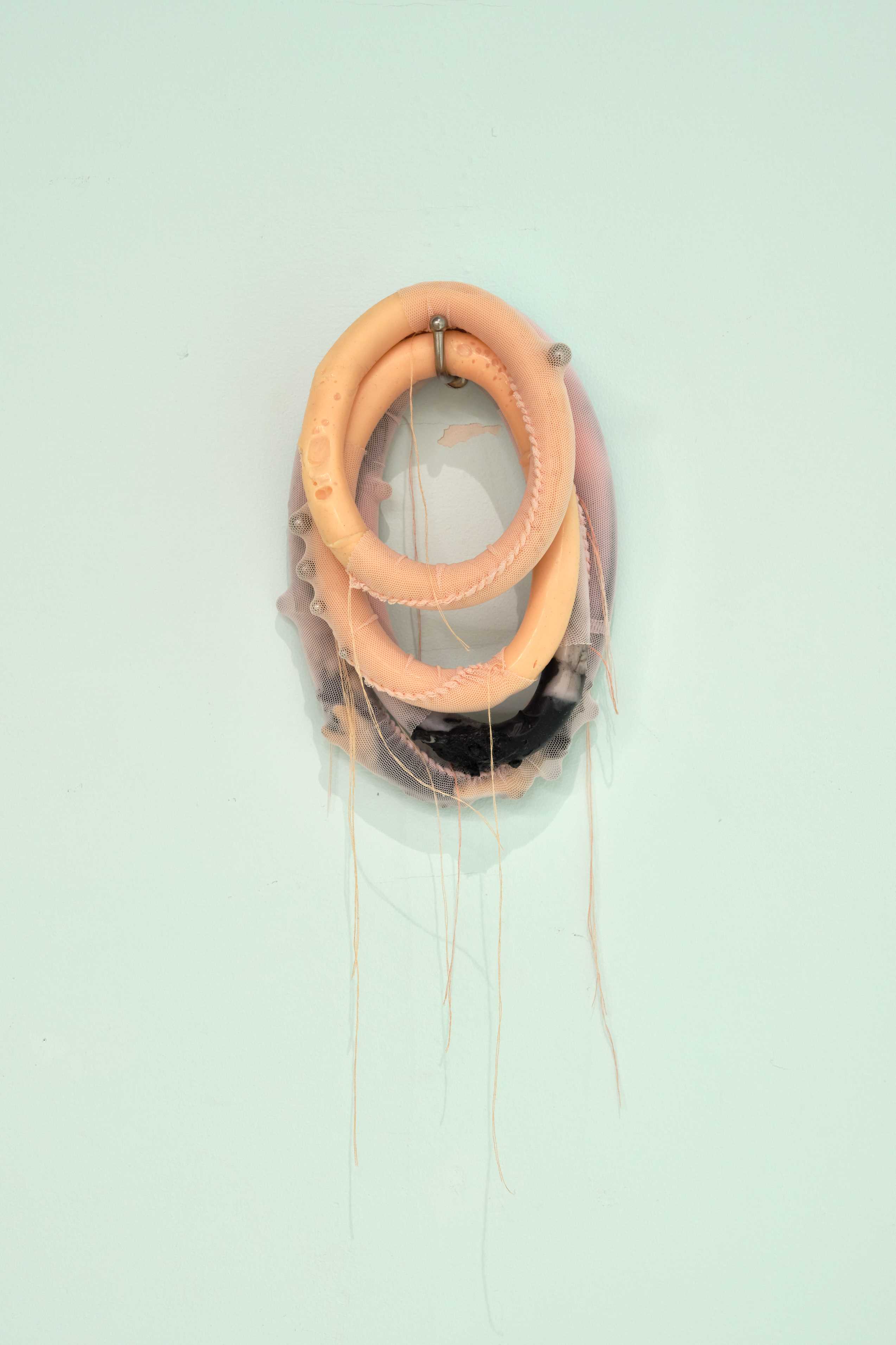 自 2020 年开始,王玉钰将女性的舒适贴身衣物与硅胶铁丝相结合,创造了一种混合组合物。本次展览中呈现的四组雕塑则更具生物形态,从以肉色为主要基调到不同程度灰色的转变,不同材料的拼补与反复折叠形成不同空间层次、形状与体量的改变;而一个个“隐藏”的尖状物仍述说着个体处境。王玉钰将自身开放地置于创作环境中,津津乐道地观察和无意识地追随着这些占领了工作室的有机生物(爬行动物等),在极其缓慢的手作中酝酿着动荡与爆发力。作品中硅胶、布料和金属编织出的“身体”既是一个脆弱和亲密的巢穴,也是抵抗和力量的蔓延。在形态塑造和重构的过程中,正形与负形共生与堆叠重合,本体即在眼前。