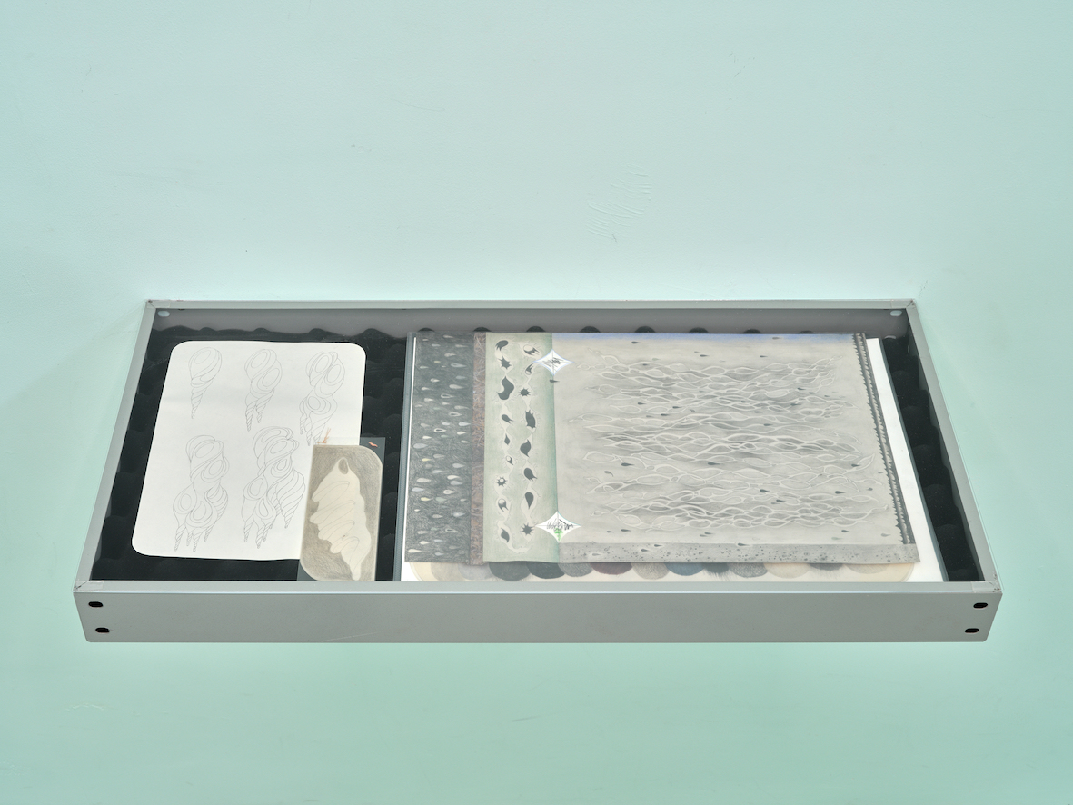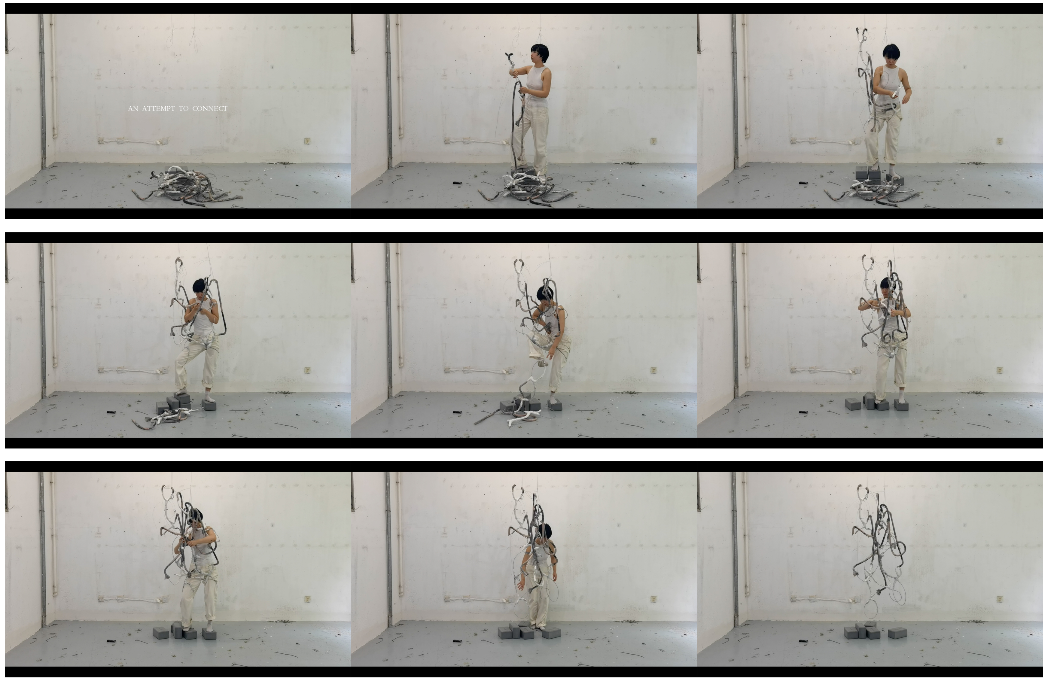 从探索身体本身到创造身体逻辑,王玉钰试图通过材料和空间去转换并传达自己作为人类的身体感知。一切以圆作为起点——在行为影像中与身体接触的临时圆圈,在雕塑中持续建构框架的圆形存在,在草稿中的圆形痕迹,零散的材料在圆形框架里不断聚散聚合,最终凝结成一个点,强调了实时的开放过程,同时也宣告了某个阶段的完结。