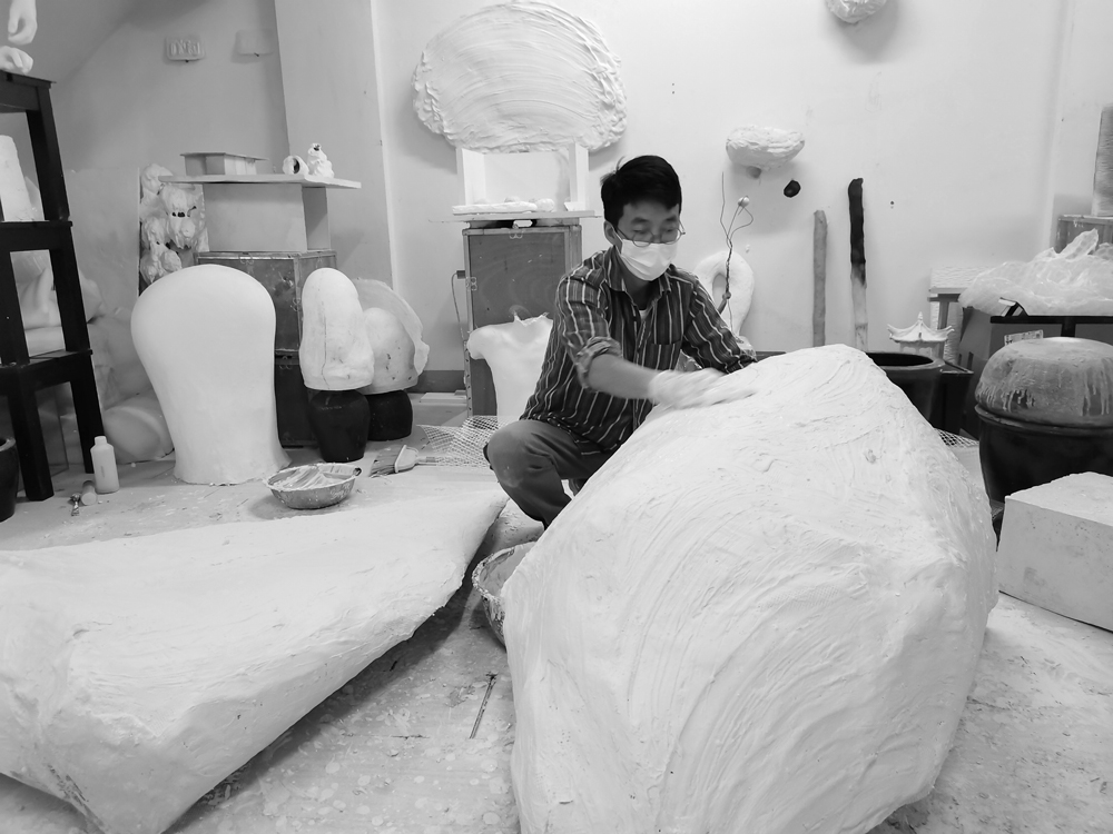 用石膏作为其雕塑创作主要的材料是欧鸣最早为人所知的特点。十八年来,随着创作的深入及阅历的积累,欧鸣的雕塑变得越来越“简单”。作品中没有复杂的造型,观众看不到任何意图,创作主体变得越来越透明。
