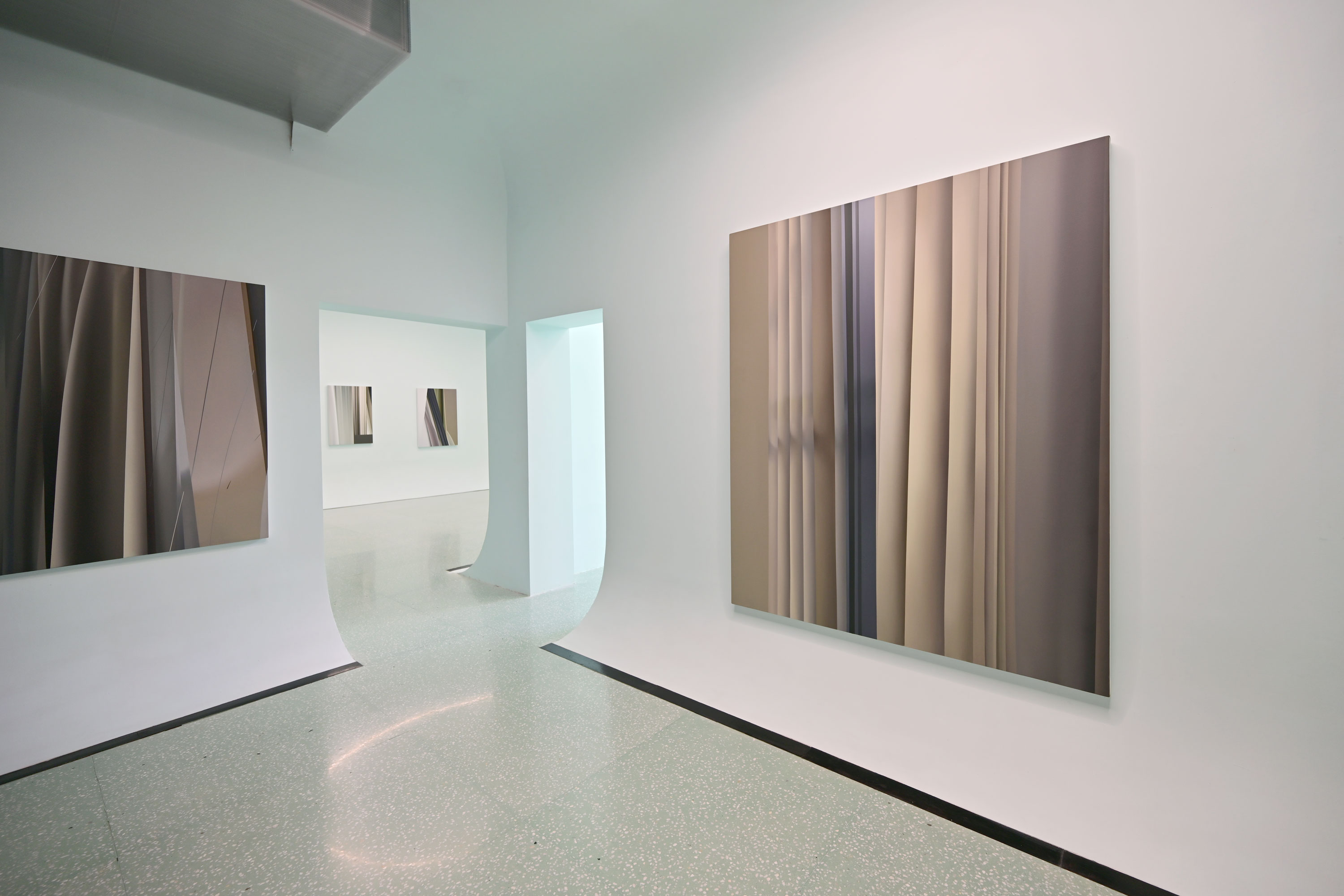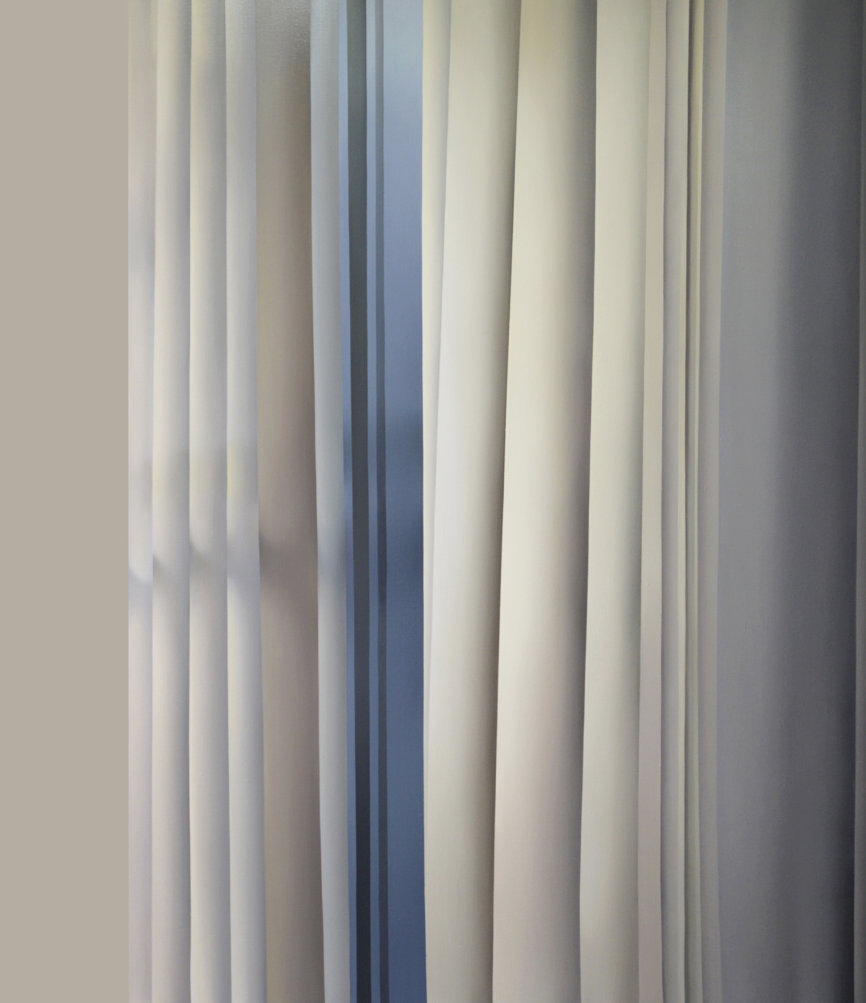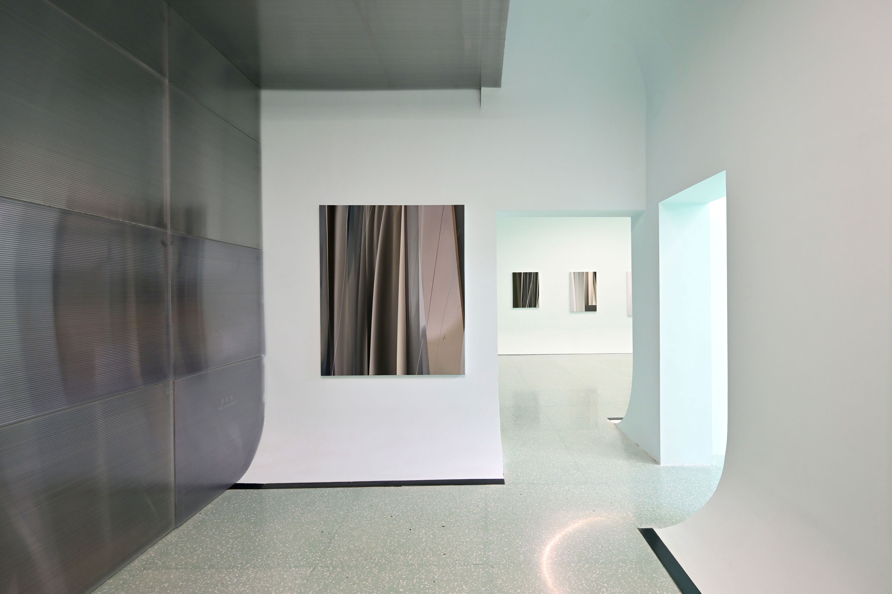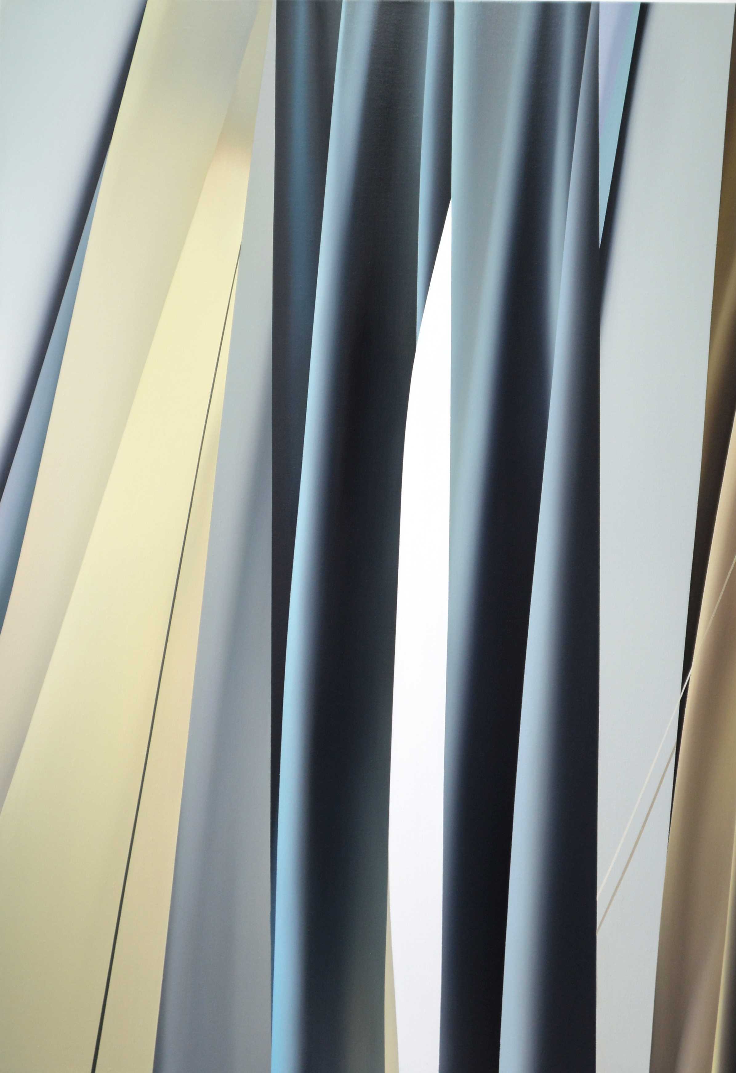 窗帘是此次展出系列作品中重要的母题。艺术家着迷于窗帘对光线的呈现:现实中窗帘背后总是有光透过来,形成波浪的褶皱与阴影,使其成为了最能够提供抽象因素的完美中介。