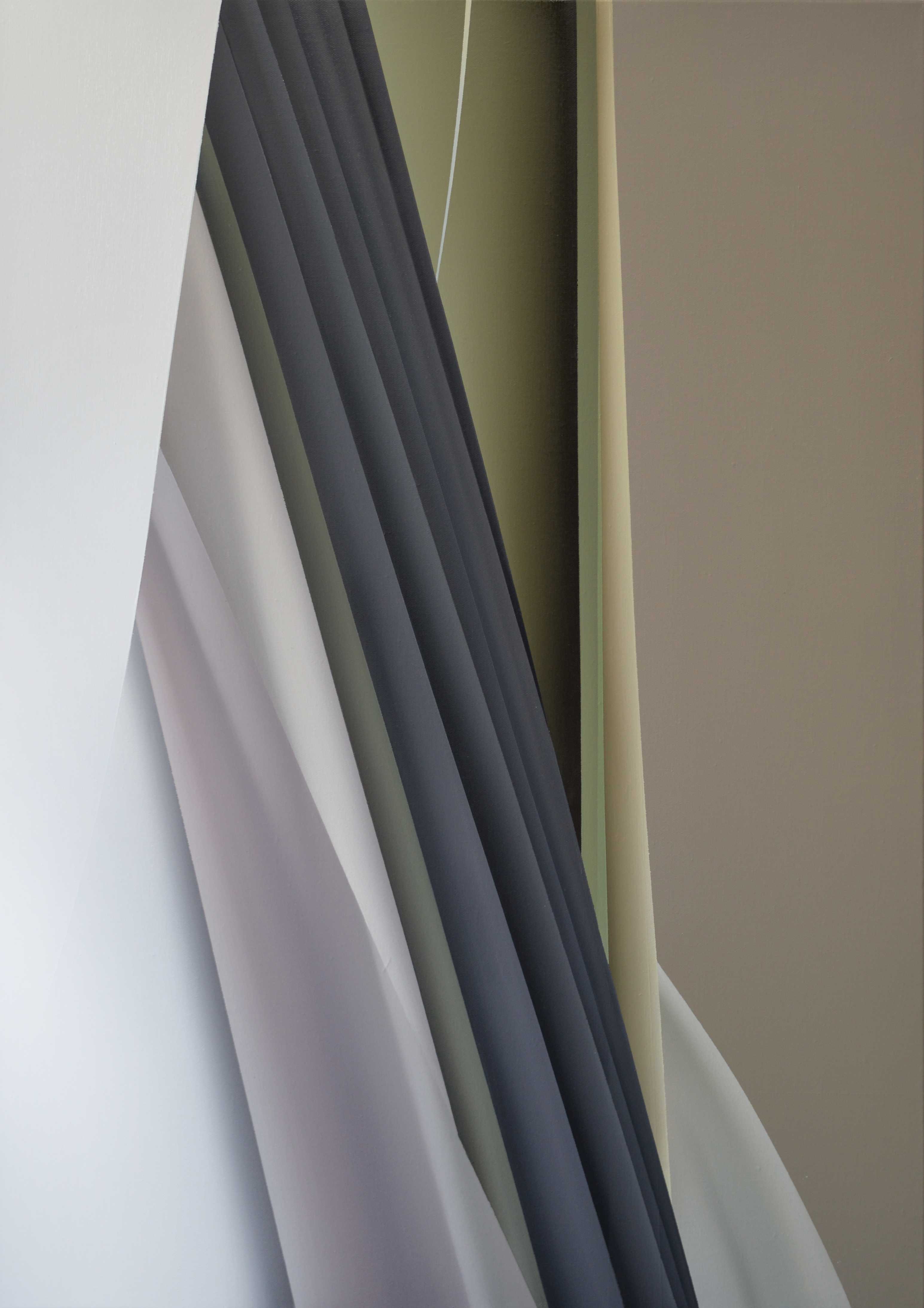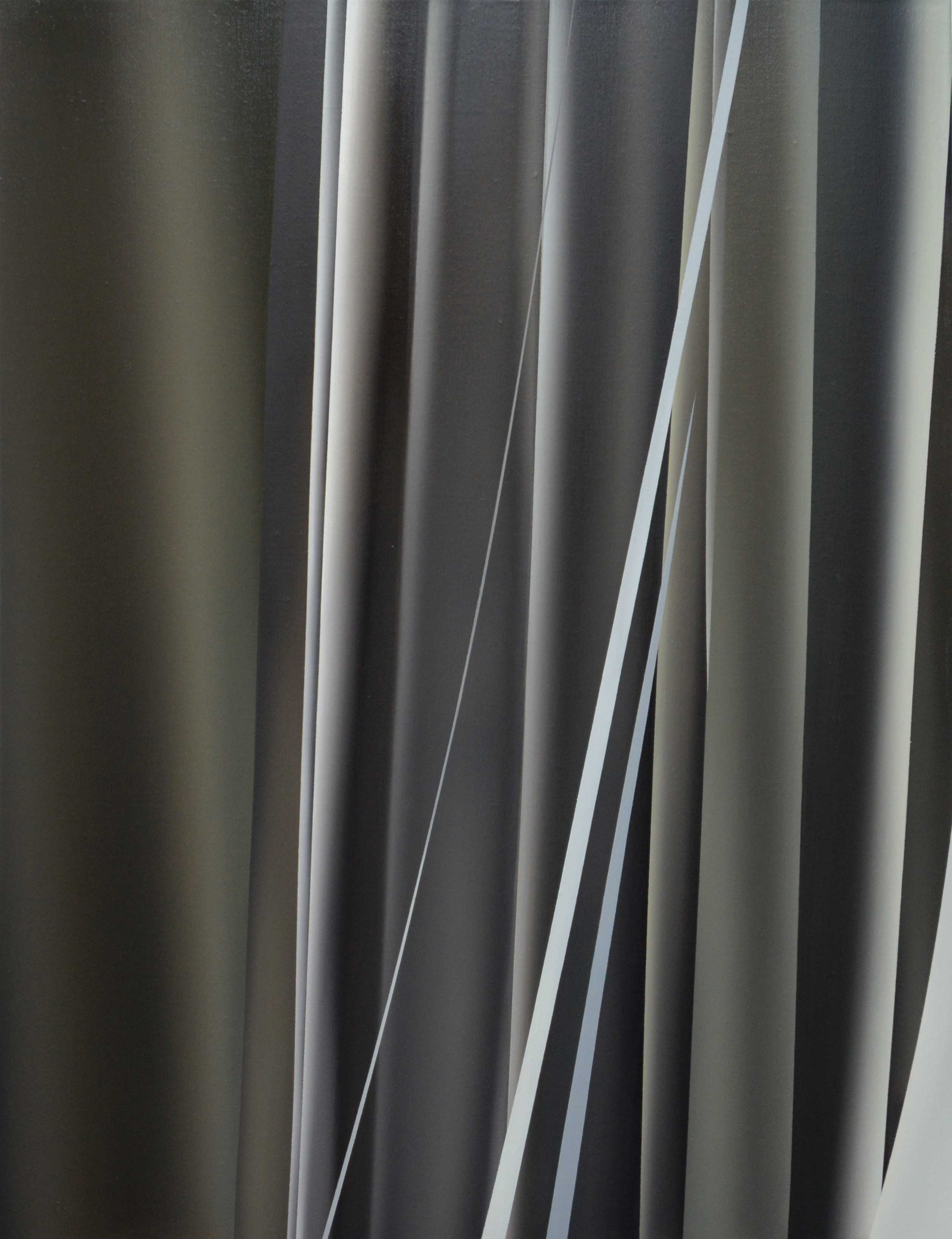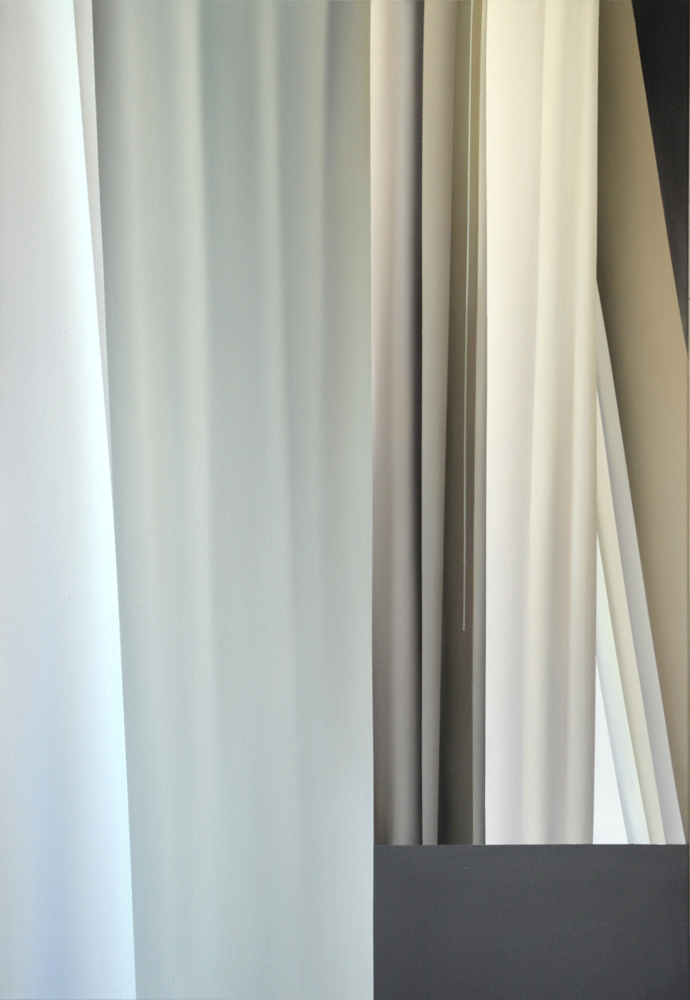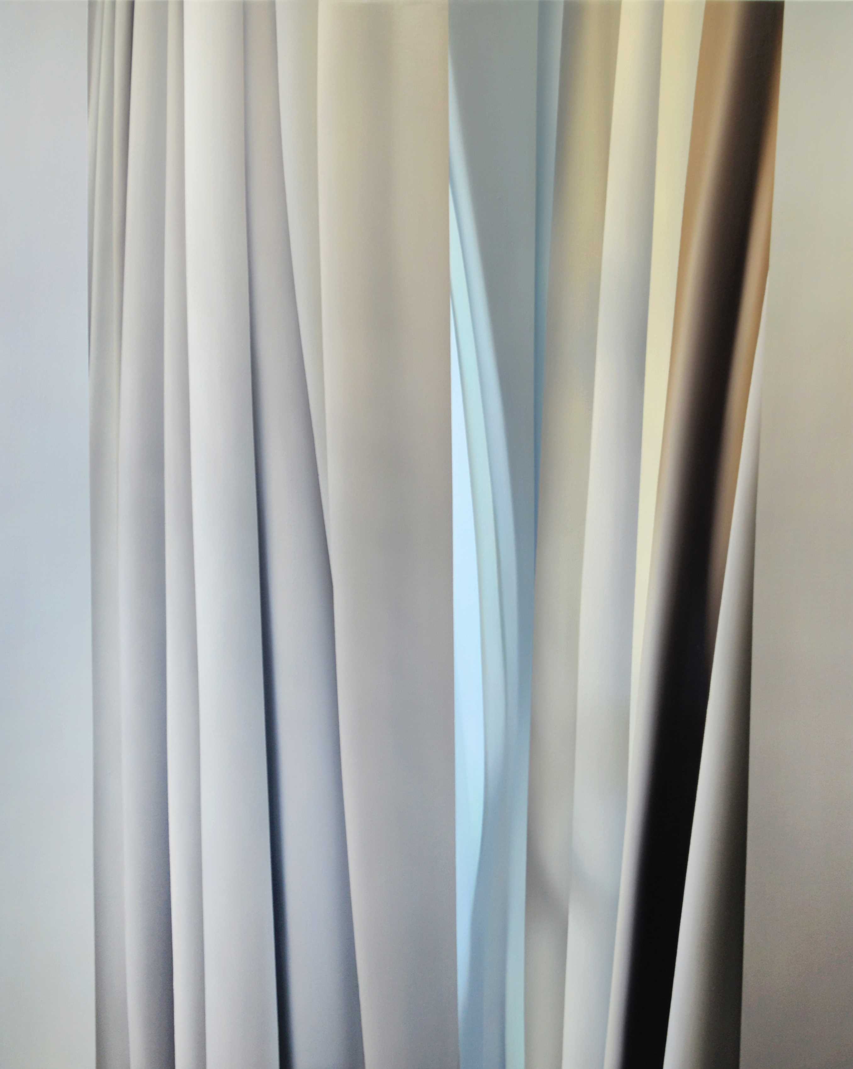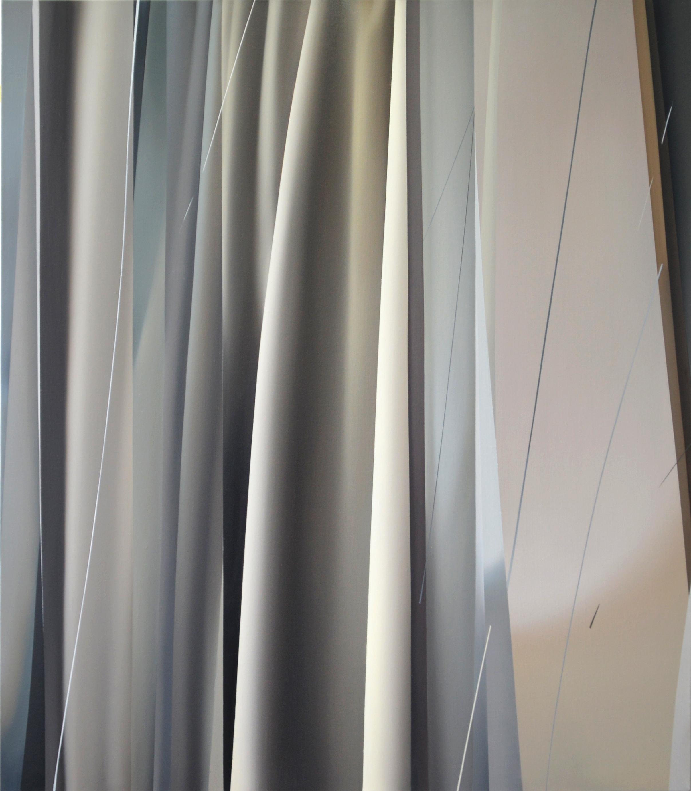 窗帘是此次展出系列作品中重要的母题。艺术家着迷于窗帘对光线的呈现:现实中窗帘背后总是有光透过来,形成波浪的褶皱与阴影,使其成为了最能够提供抽象因素的完美中介。