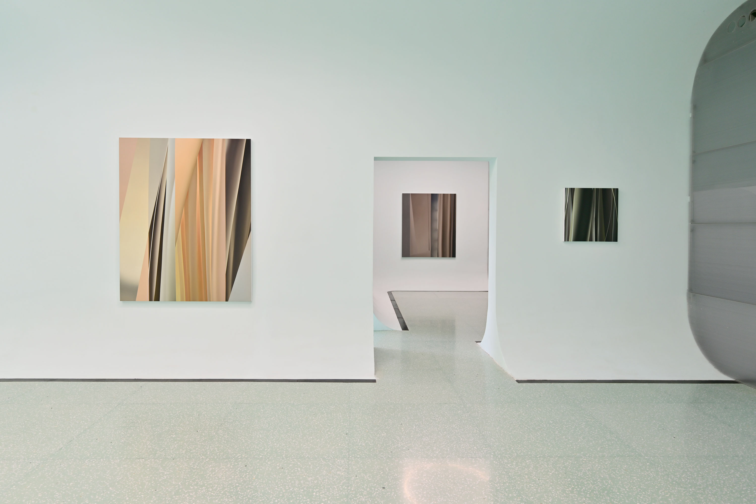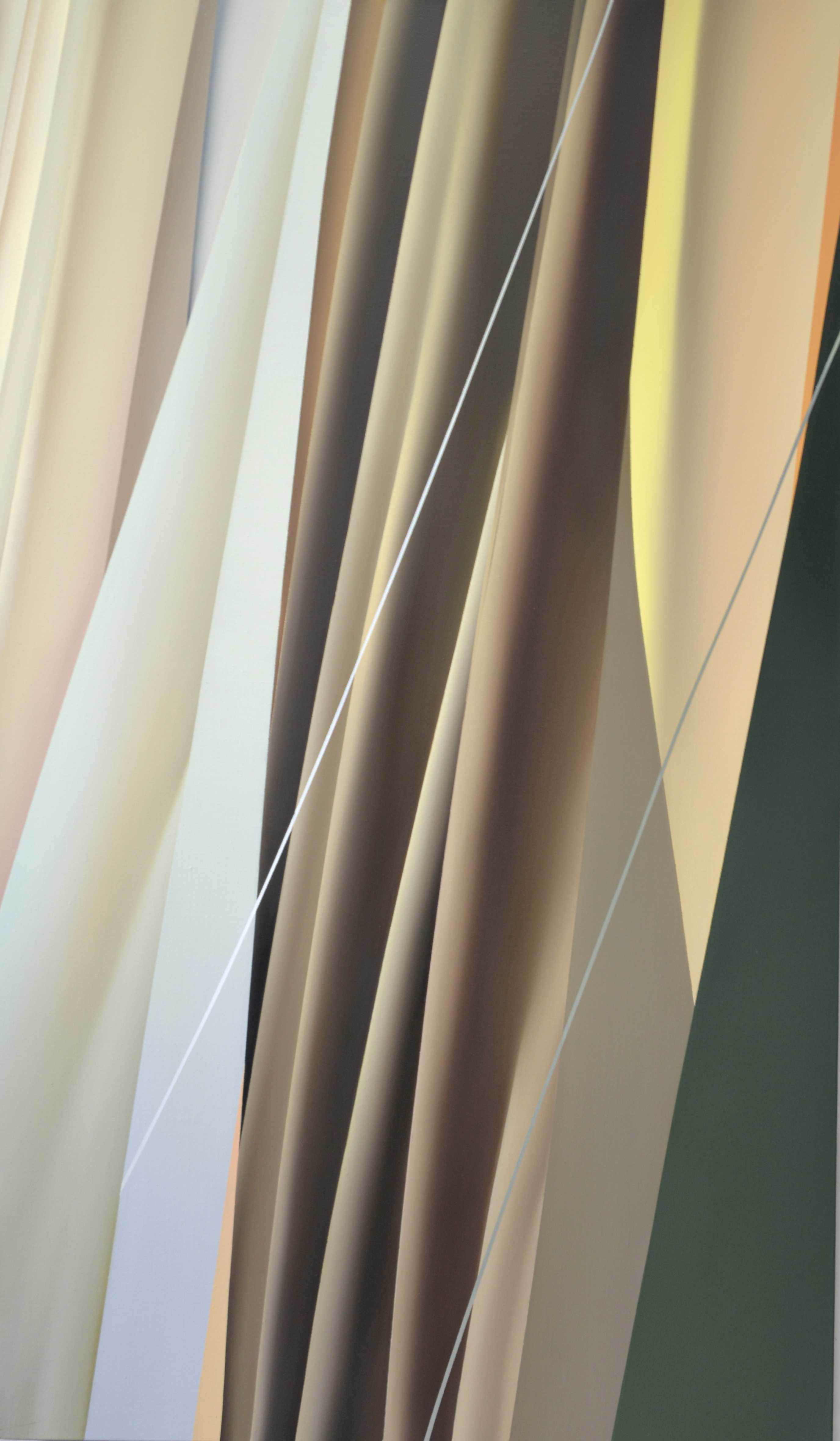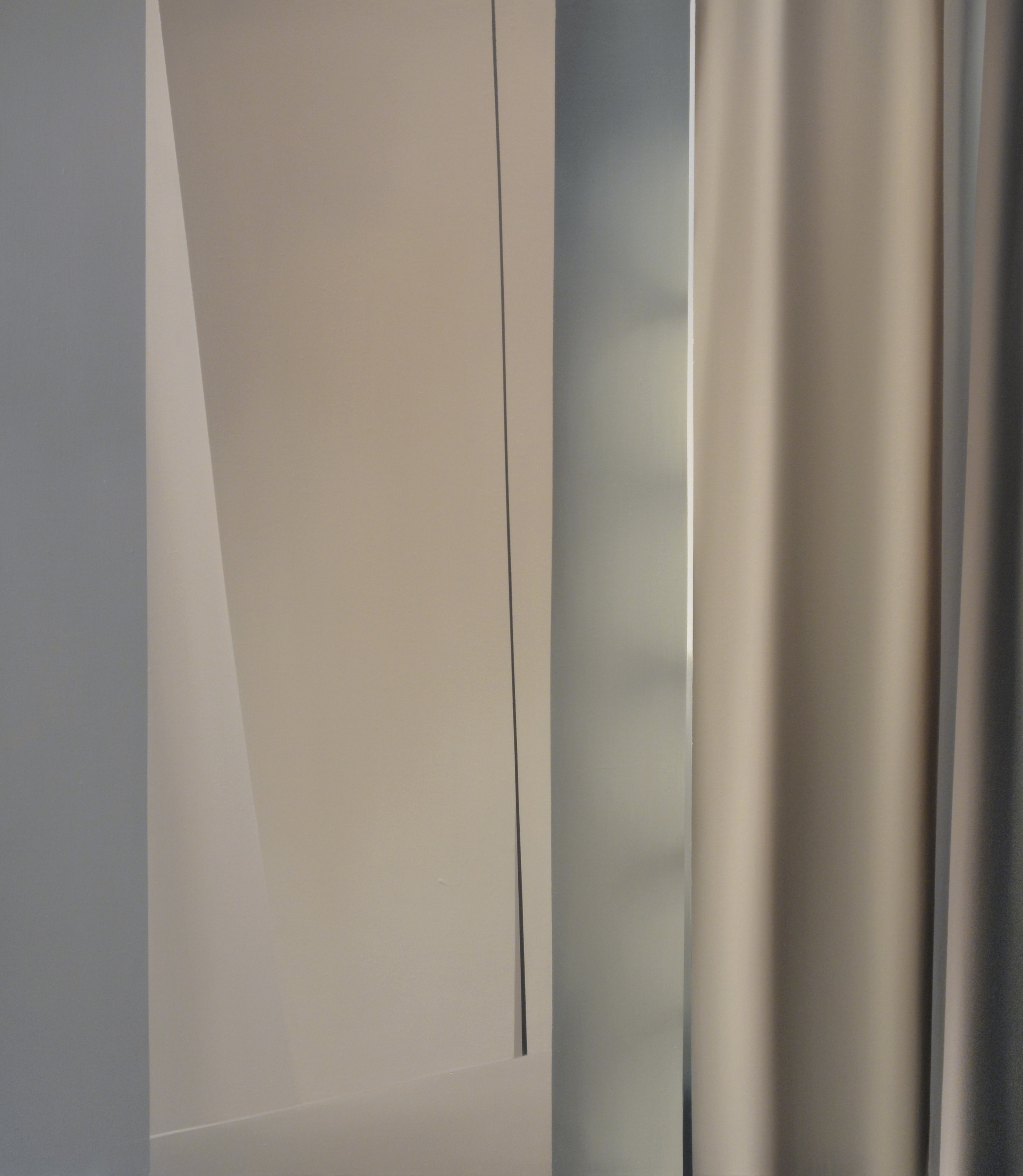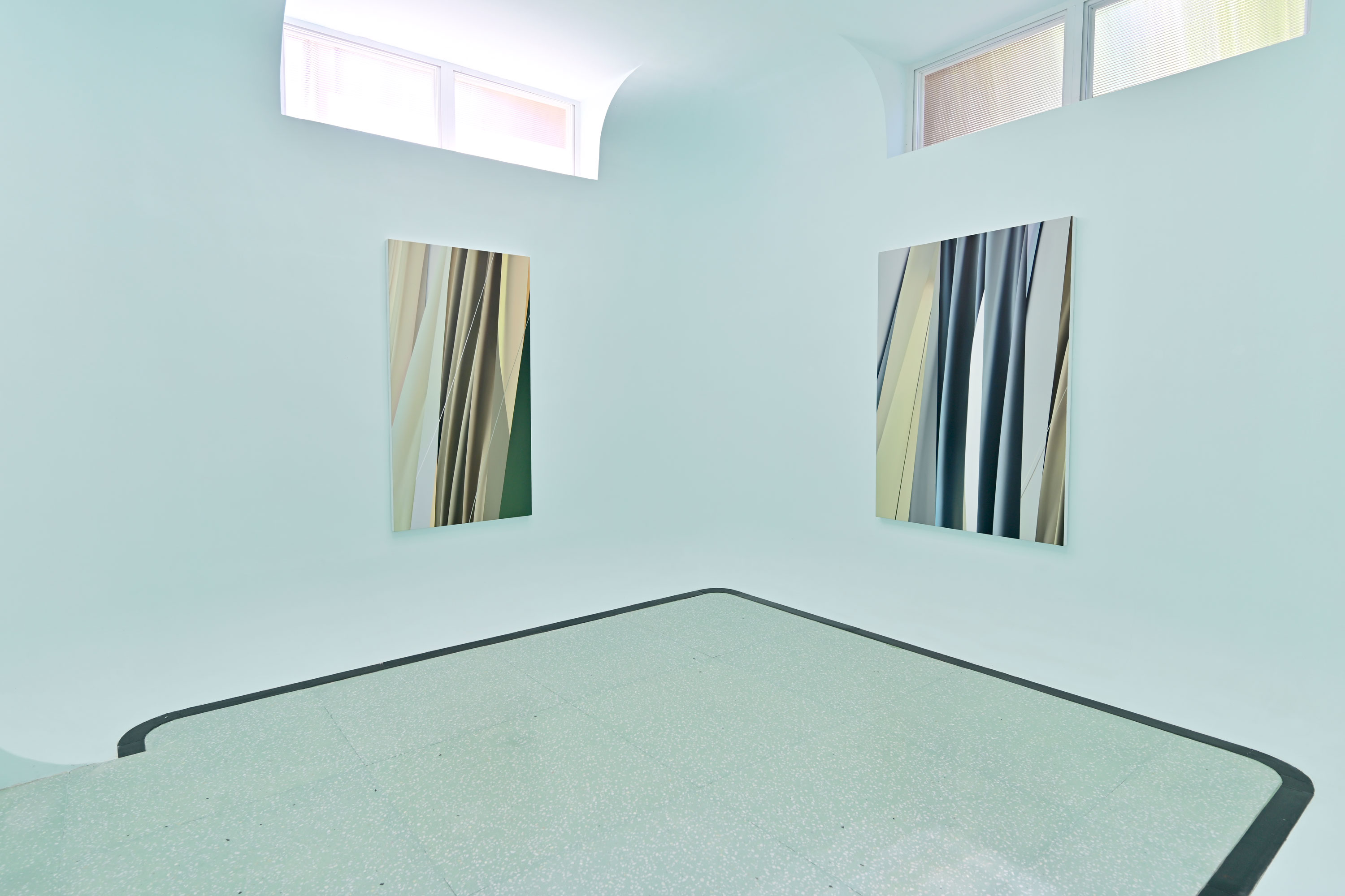 窗帘是此次展出系列作品中重要的母题。艺术家着迷于窗帘对光线的呈现:现实中窗帘背后总是有光透过来,形成波浪的褶皱与阴影,使其成为了最能够提供抽象因素的完美中介。