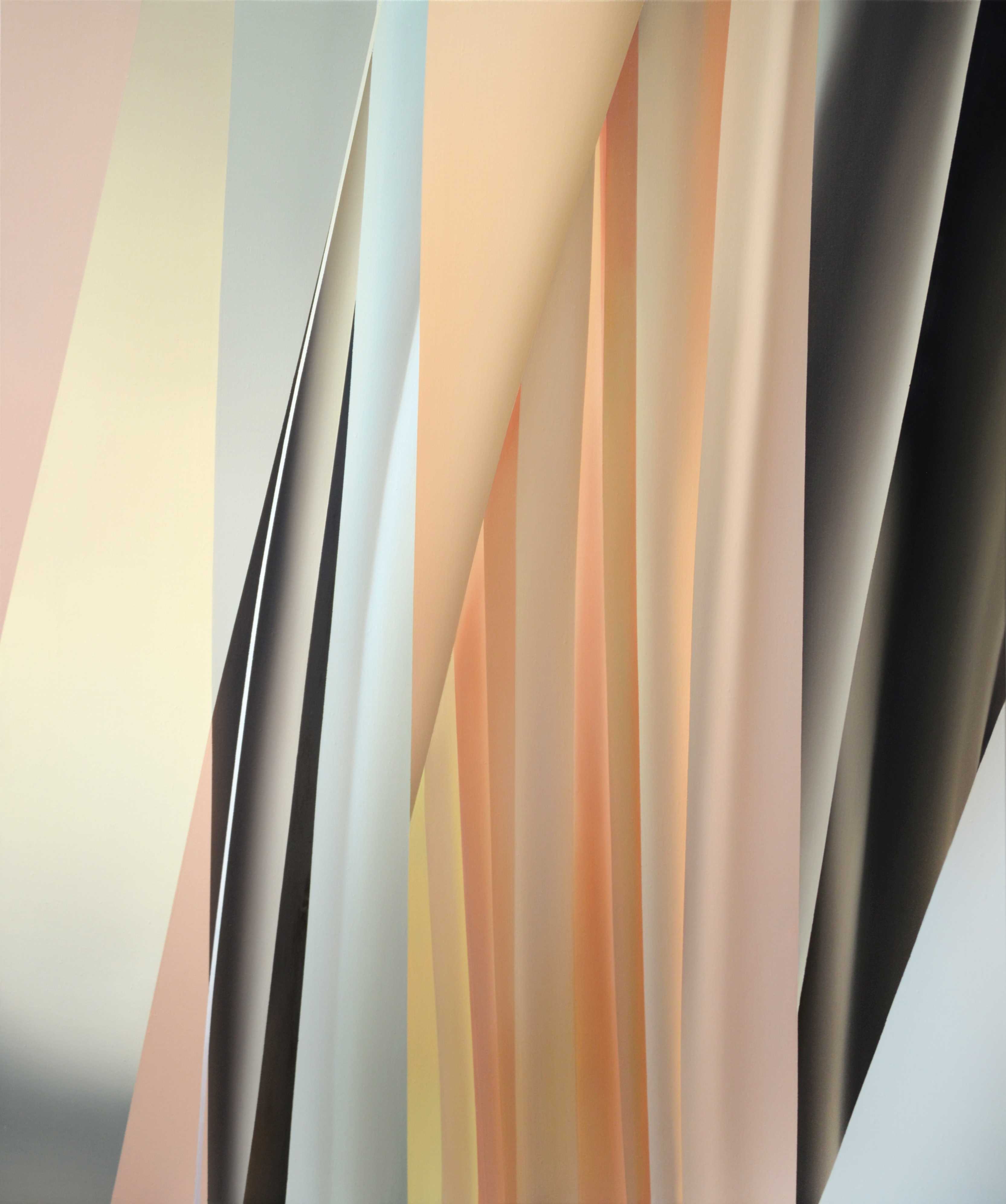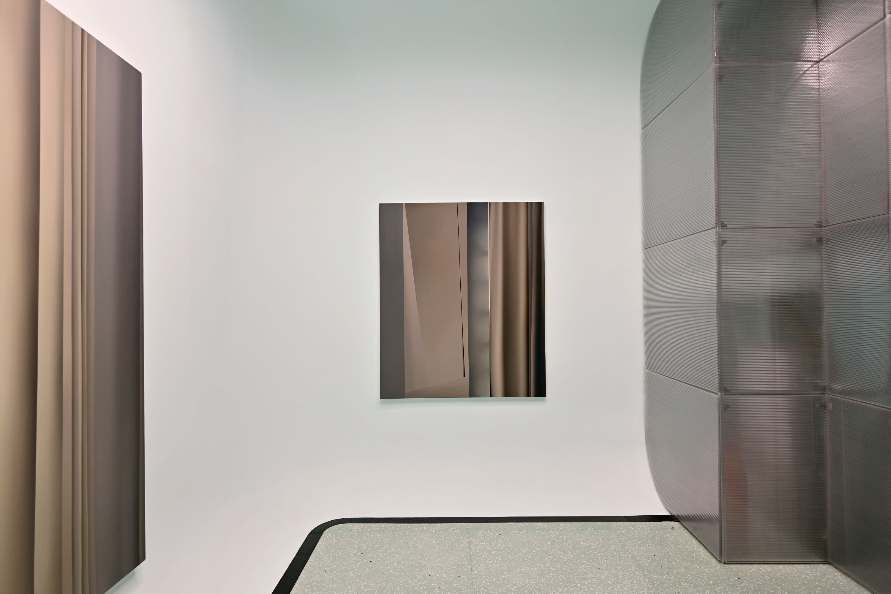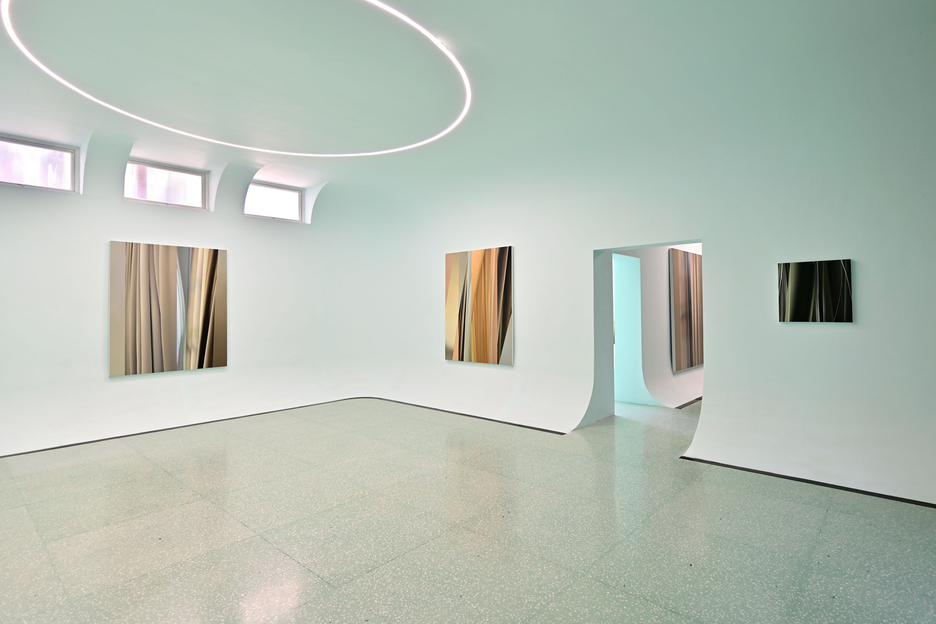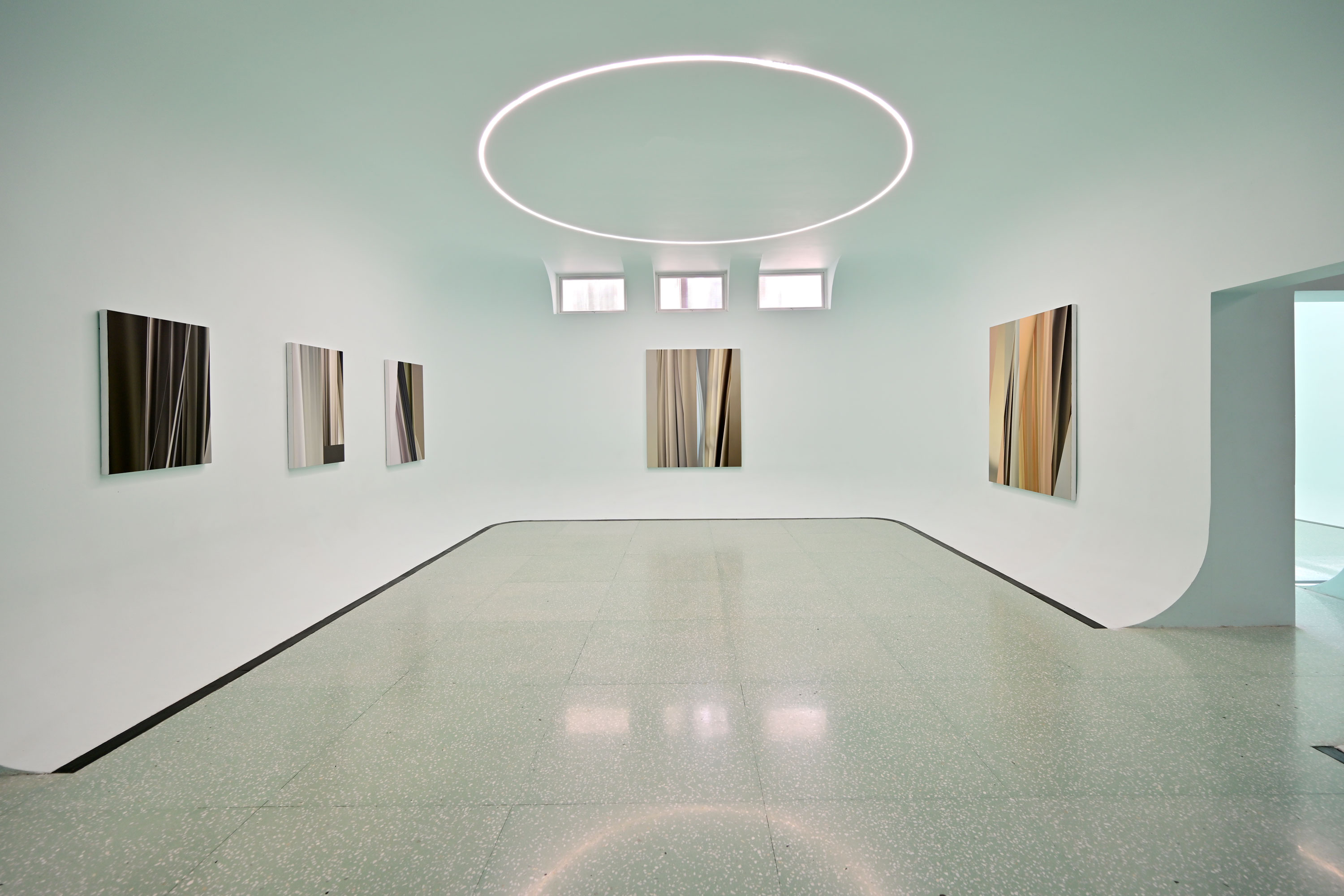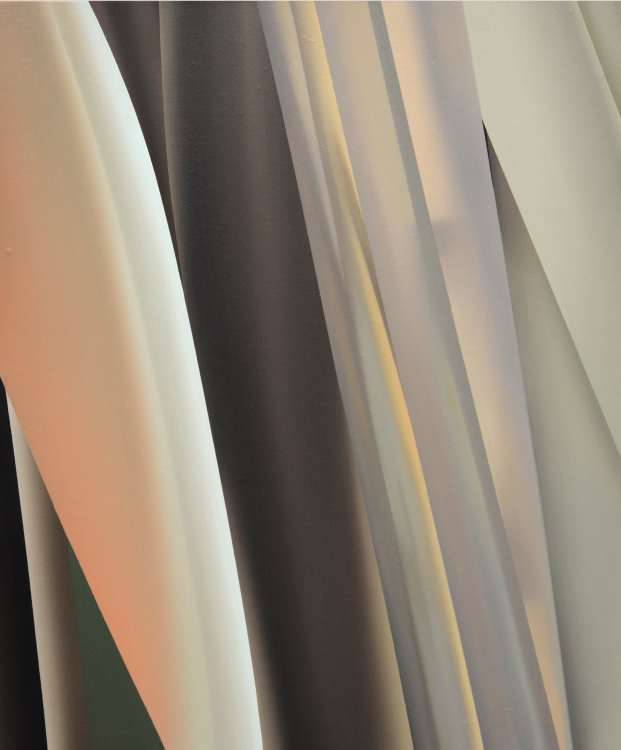 窗帘是此次展出系列作品中重要的母题。艺术家着迷于窗帘对光线的呈现:现实中窗帘背后总是有光透过来,形成波浪的褶皱与阴影,使其成为了最能够提供抽象因素的完美中介。