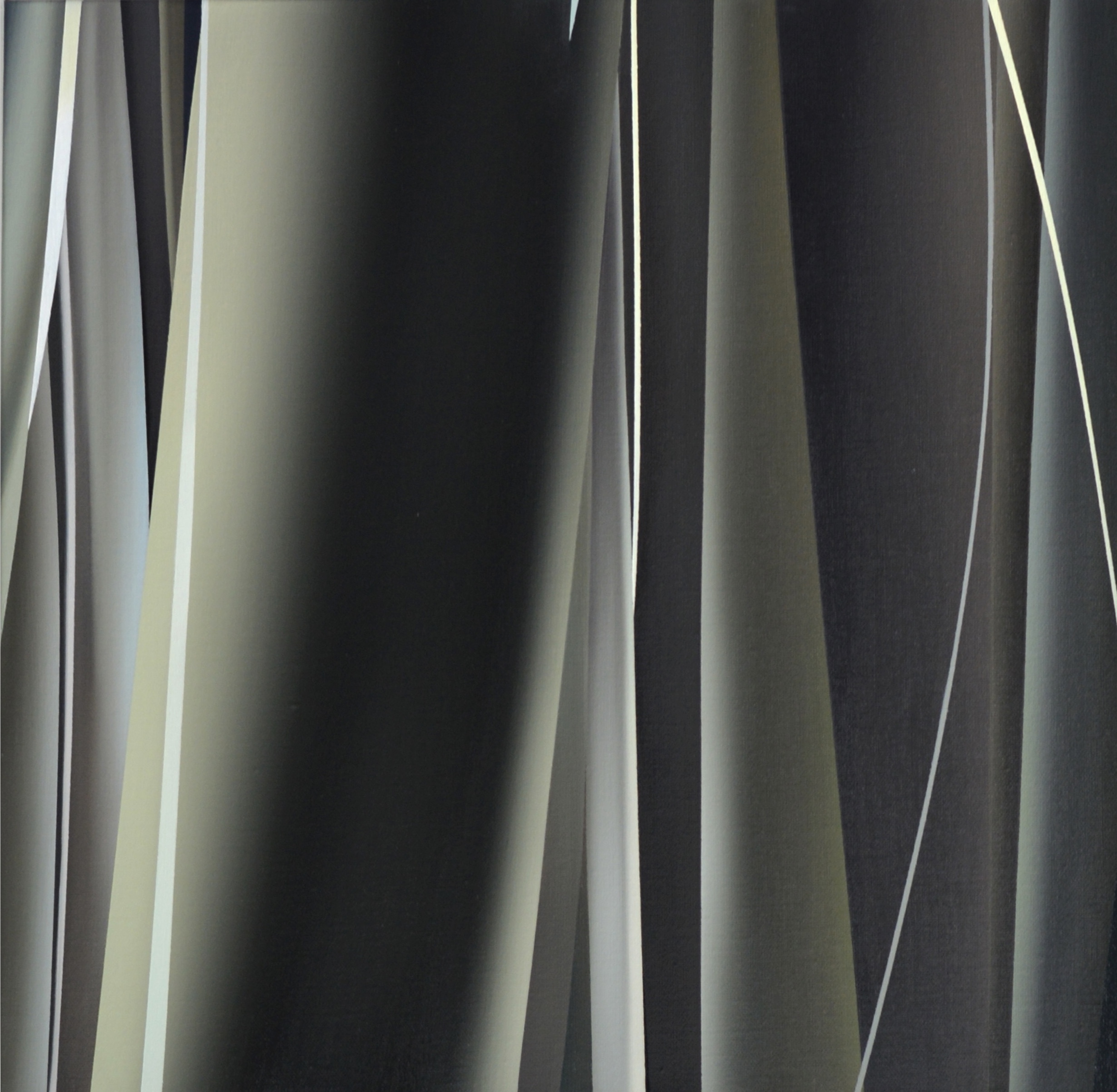 “最早的契机是我到了一个完全陌生的环境,刚刚到明尼苏达市那个地方,中国人蛮少的,我也不认识任何人,当时就觉得我唯一认识的是我寝室里床旁边的一盏灯,灯罩上面一棱一棱的,所以我开始尝试用灯罩这个形式去画过一些抽象画,然后再过渡到窗帘也是竖条状的。”
